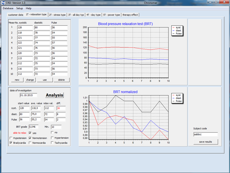 Der Blutdruck ist ein empfindlicher Indikator für Veränderungen der emotionellen Prozesse. Beim Blutdruckentspannungstest (BET) wird die Person gebeten in einem Sessel mit Fußhocker Platz zu nehmen, seine Muskulatur zu lockern und mit geschlossenen Augen bei gleichzeitiger, bewusster Wahrnehmung der Atemzüge 10 Minuten lang zu relaxieren. Während dieser Zeit werden der Blutdruck und die Pulsfrequenz im Minutenintervall gemessen. Gewöhnlich wird der "Ruheblutdruckwert" (bezogen auf den systolischen Blutdruck) erst in der 7. -